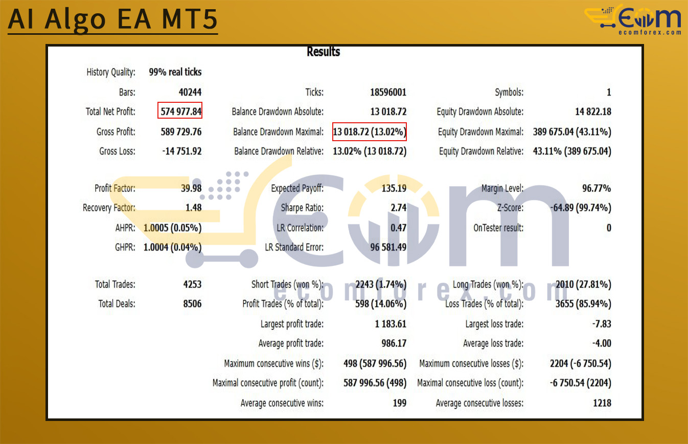 The AI Algo EA demonstrates extraordinary profitability and strong trade discipline, showcasing its ability to balance aggressive growth with controlled risk management. In this backtest, the system generated $574,977.84 in net profit, supported by an exceptionally high profit factor of 39.98 and a solid Sharpe Ratio of 2.74. Despite thousands of trades executed, the EA maintained stability and delivered consistent long-term performance.