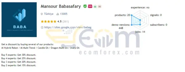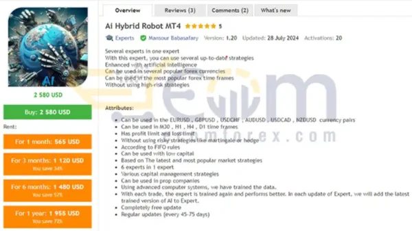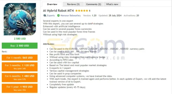 Mansour Babasafary with a team of programmers with decades of experience and the most modern powerful trading strategies and tools. There are experts in artificial intelligence systems, highly qualified mathematicians, experts in the field of forex and stock trading plus digital currencies to build safe and reputable EAs on MQL5 with 20 products and more than 500 sales and positive reviews from users show that Ai Hybrid Robot is a great choice for traders.