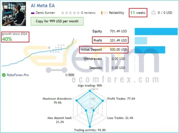 AI Meta EA MT4 represents an Expert Advisor (EA) that integrates sophisticated AI technology in trading, crafted to be compatible with the Metatrader 4 (MT4) platform. The EA employs automatic stop-loss and take-profit levels to safeguard the account while ensuring consistent performance.