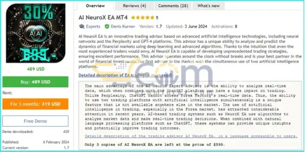 AI NeuroX EA is an Expert Advisor (EA) formulated on the Metatrader 4 (MT4) platform. This EA incorporates sophisticated AI artificial intelligence technology along with automatic Stop Loss and Take Profit settings to ensure that trading accounts are consistently safeguarded and secure.