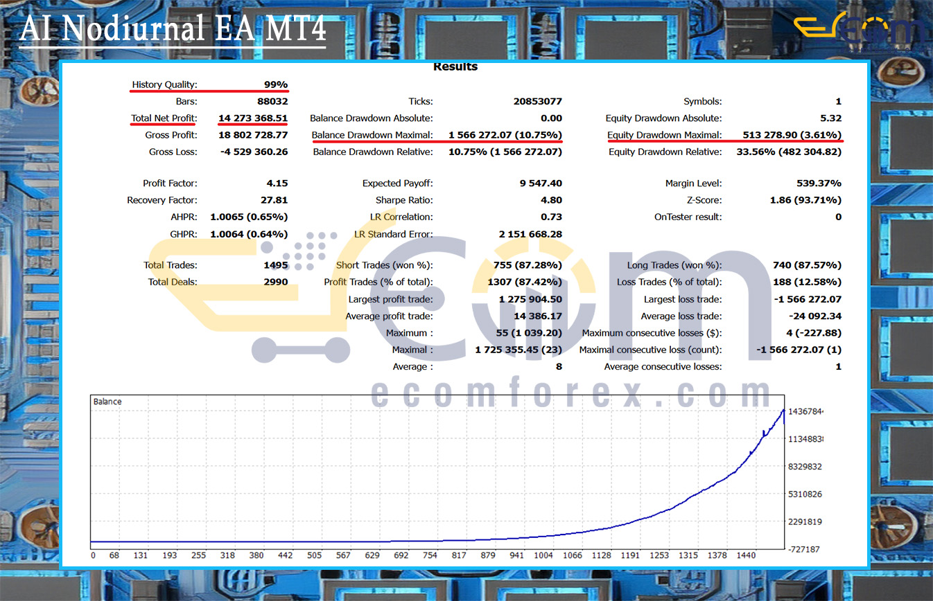 AI Nodiurnal EA delivers truly remarkable backtested results over a full 10-year period, demonstrating exceptional profit potential combined with rock-solid stability — even when facing constantly shifting market regimes, volatility spikes, economic crises, and trend reversals. Powered by its adaptive machine learning core, this MT4 EA not only survives prolonged testing but thrives, refining its approach dynamically to capture high-probability opportunities while keeping risk exposure exceptionally low.