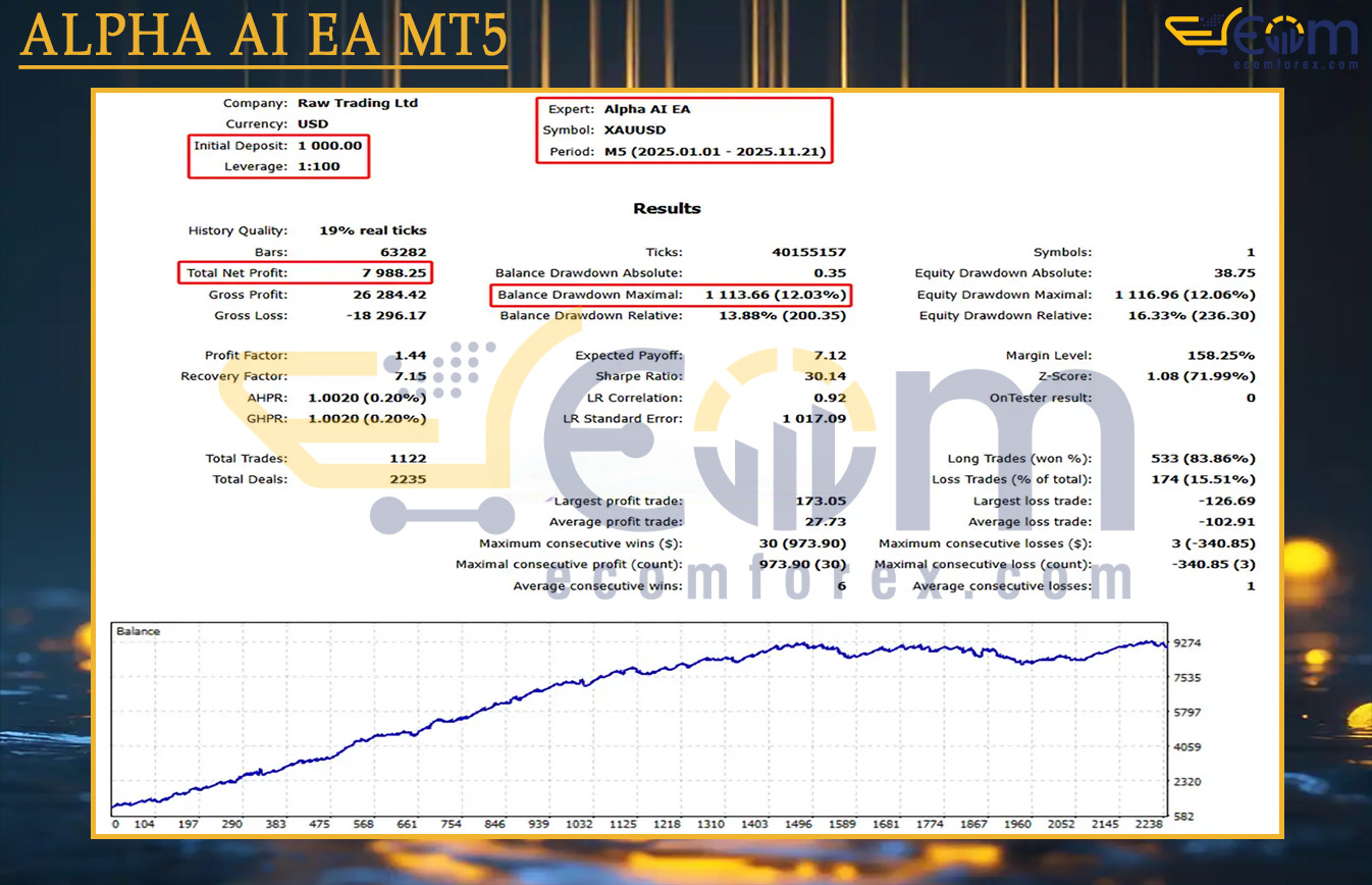 The ALPHA AI EA MT5 delivered exceptional profitability throughout its 11-month backtest on the XAUUSD pair, maintaining strong accuracy and stable performance across varying market conditions. Its disciplined trend logic and adaptive exit system allowed the EA to compound returns efficiently while keeping risk under control.