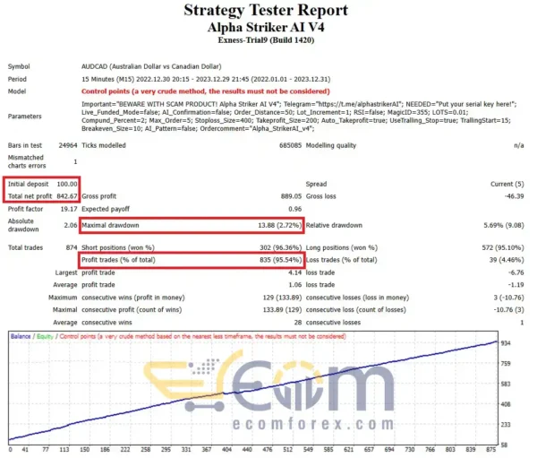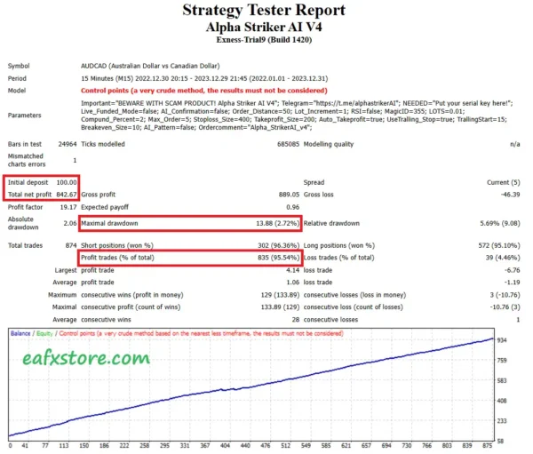 The remarkable test results of Alpha Striker AI EA showcase outstanding trading potential. With a tested capital of $100, after 12 months of trading, the profit reaches 900% of the initial investment. The noteworthy risk level remains at just 2.72%. This highlights the extraordinary future profit potential of Alpha Striker AI.