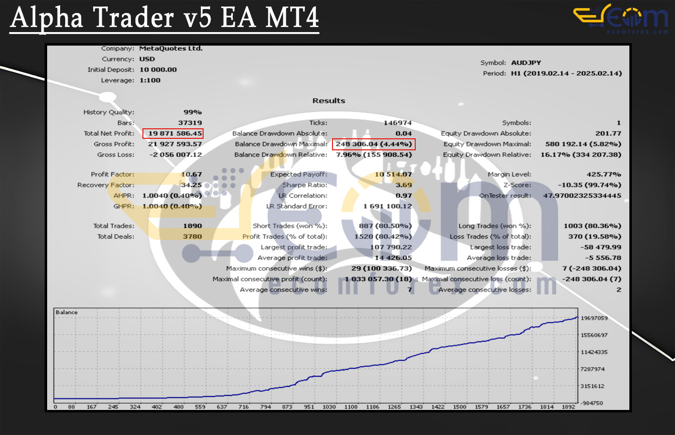 Alpha Trader v5 EA MT4 demonstrated exceptional long-term profitability throughout this multi-year backtest on the AUDJPY H1 timeframe, maintaining a smooth and consistently rising equity curve. Leveraging geometric pattern forecasting, adaptive market logic, and precise risk control, the EA delivered powerful compounding growth while keeping drawdown firmly contained. Its disciplined execution framework shows strong robustness across varying market conditions.