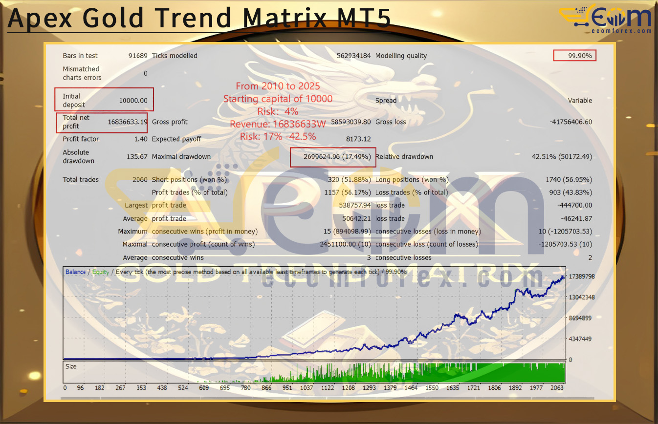 Apex Gold Trend Matrix has delivered outstanding long-term performance in rigorous backtesting, proving its ability to generate exponential profitability while maintaining disciplined risk management. Over a 15-year test period (2010–2025), the system consistently scaled equity growth, making it a powerful option for traders seeking sustained returns with structured risk control.