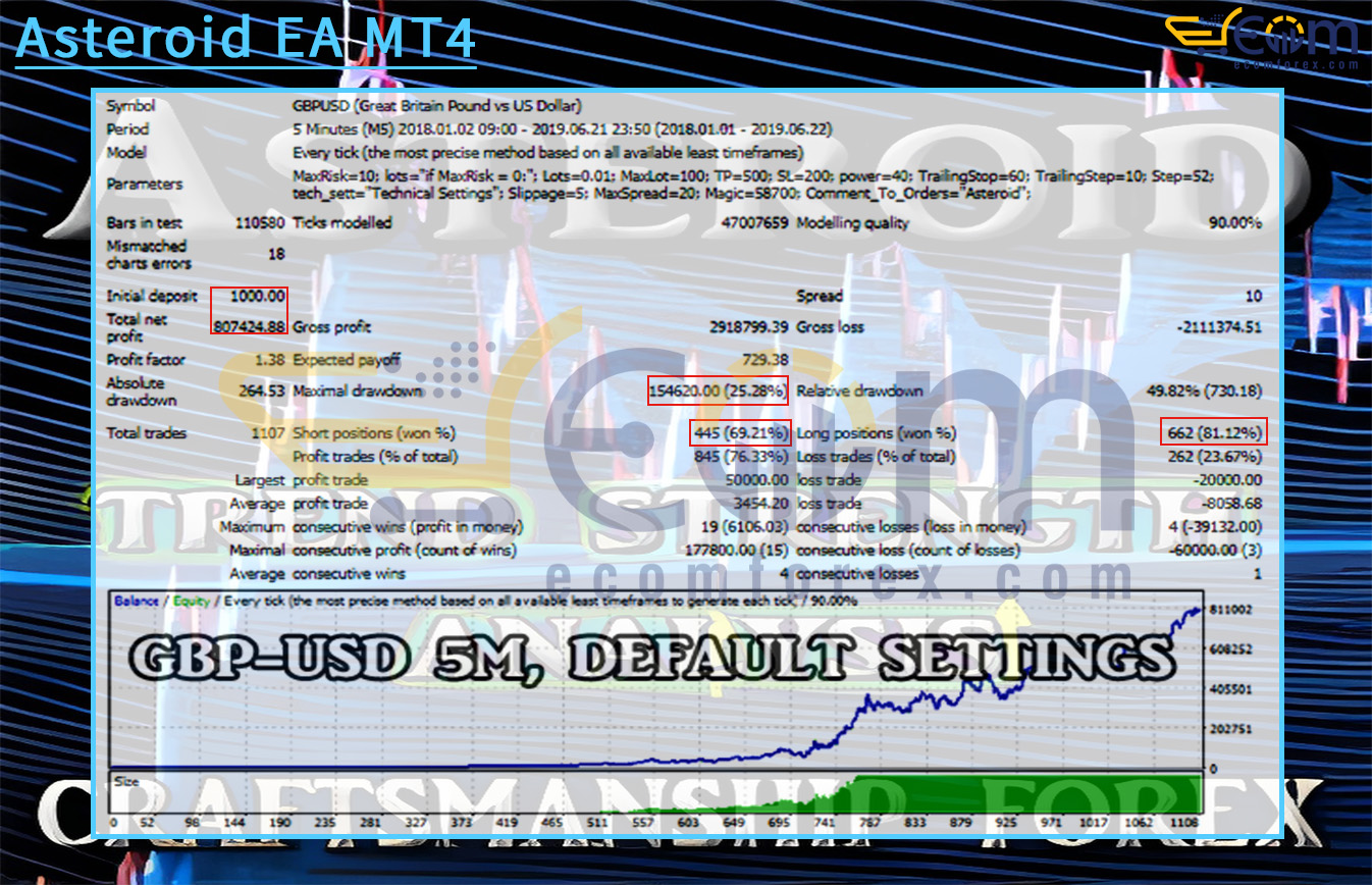 The Asteroid EA has shown robust and profitable performance in backtesting, confirming its capability to deliver consistent returns on GBPUSD with controlled risk. Over the 1.5-year testing period (2018–2019, M5 timeframe, default settings), the system proved its efficiency by generating significant net profit while keeping drawdowns at manageable levels.