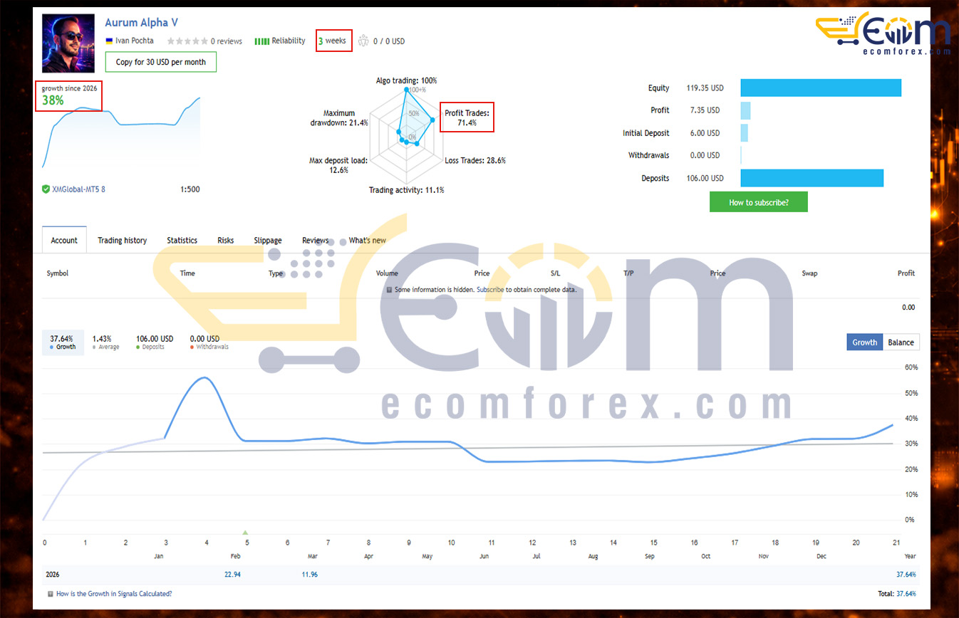 Aurum Alpha V EA has demonstrated strong early real-account momentum on XAUUSD (Gold), posting solid gains in just 2 weeks of live trading. This multi-strategy Gold specialist quickly turned a micro starting balance into meaningful growth, showcasing its ability to capture high-probability setups while navigating Gold’s characteristic volatility.