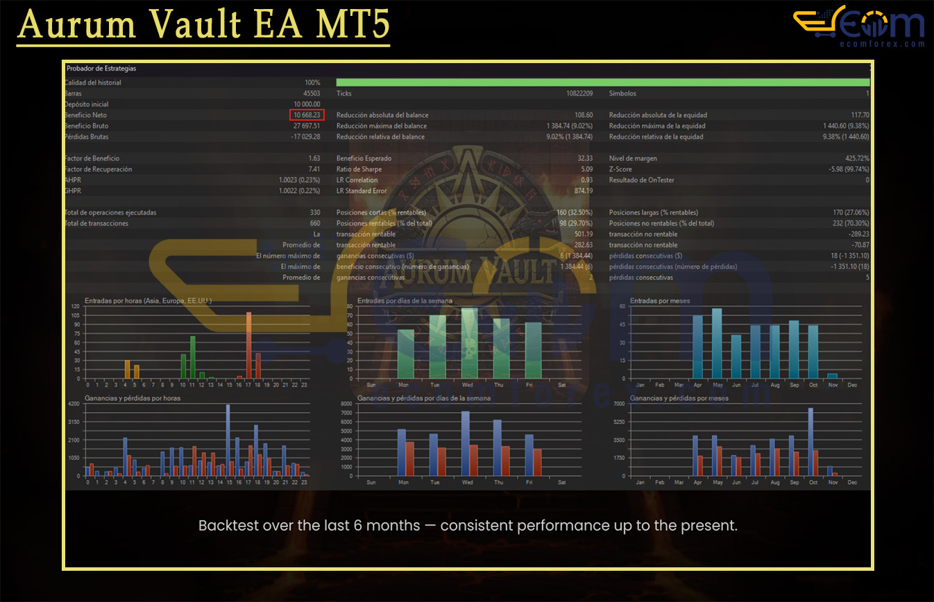 Aurum Vault EA MT5 delivered strong and highly consistent performance in a 6-month real-tick backtest (mid-2025 to present), effectively combining Smart Money Concepts (order blocks, liquidity zones, fair value gaps) with multi-timeframe confirmation and AI validation for reliable, high-probability entries on XAUUSD or similar instruments.