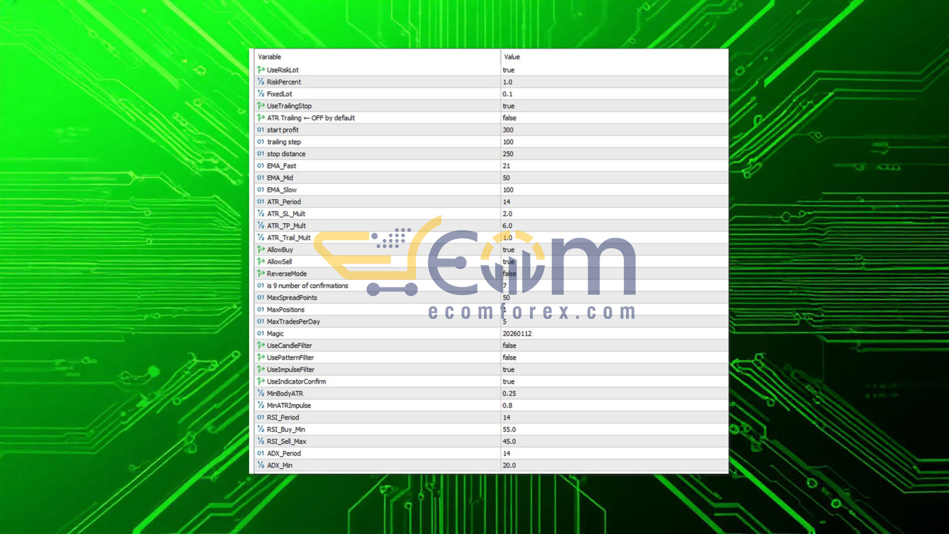 • Smart Position Management: ATR-based Trailing Stop, daily trade limits, maximum open positions control, and automatic closure of conflicting signals.