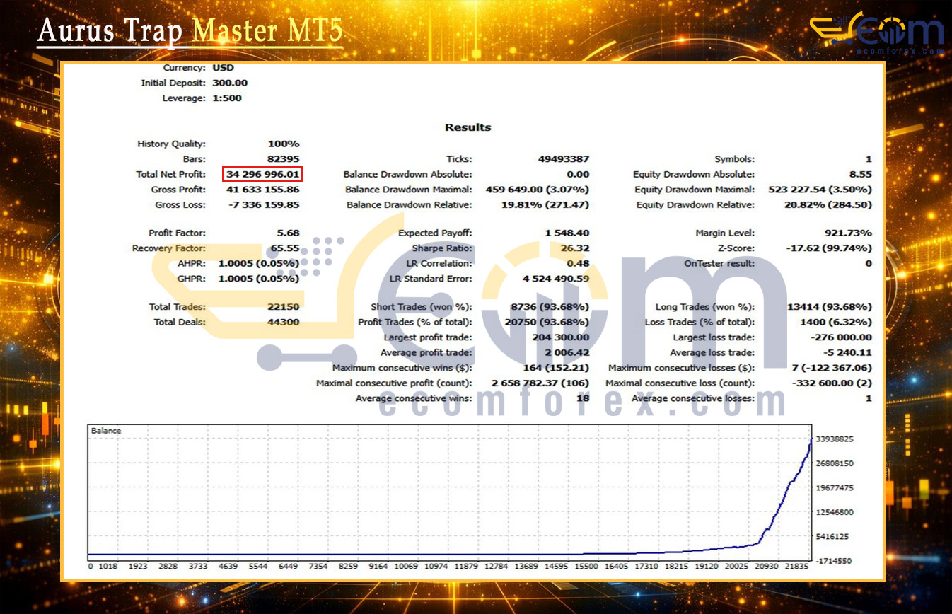 Aurus Trap Master MT5 delivered outstanding long-term profitability in this extensive backtest on XAUUSD (Gold). Starting with a modest $300 initial deposit, the EA generated a massive $34,296,996.01 net profit through its innovative “Double Trap” momentum system.