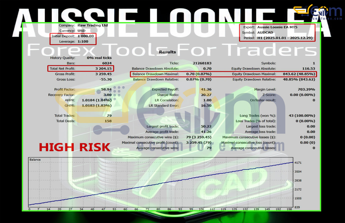 Aussie Loonie EA MT5 has shown strong profit potential when pushed to higher risk levels.