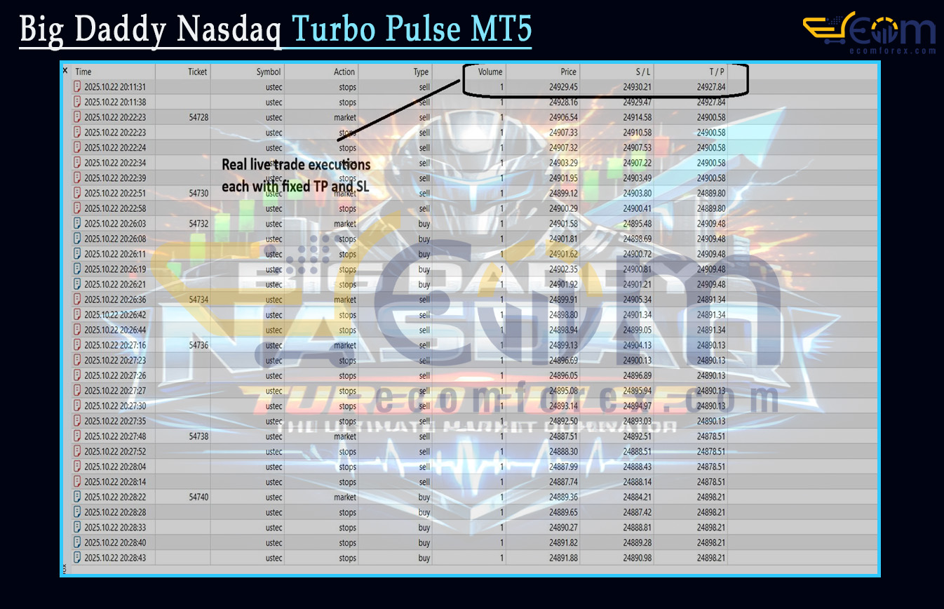 With 20+ years trading indices, tech momentum, and high-frequency scalping, I consider Big Daddy NASDAQ Turbo Pulse MT5 the apex predator among MT5 Expert Advisors for the Nasdaq 100 (NAS100 / US100 / NDX / NQ). This is not a lagging-indicator bot—it’s a raw-tick impulse machine engineered to dominate the ultra-fast, liquidity-driven New York session without getting chopped up in noise.