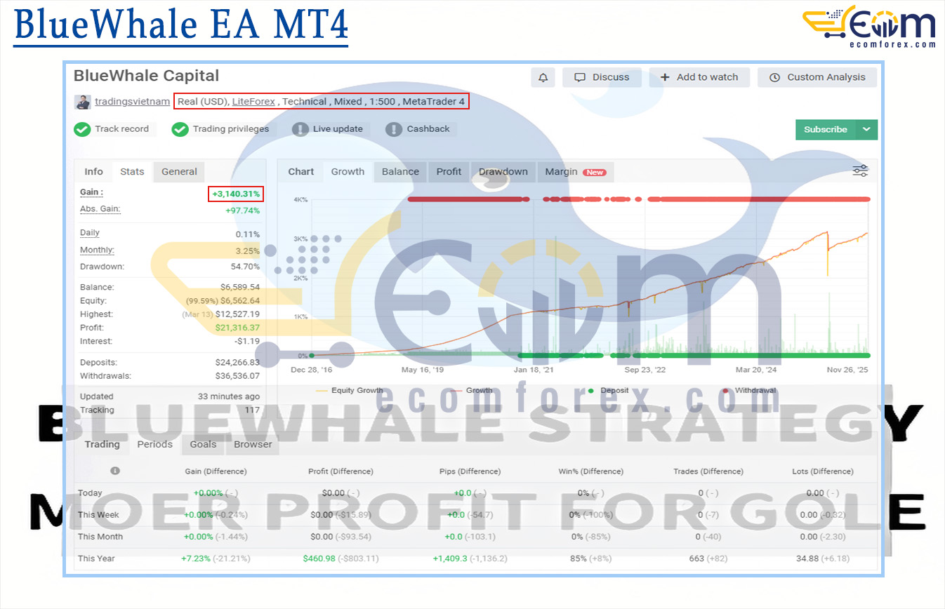 The BlueWhale EA MT4 has demonstrated proven long-term profitability on Myfxbook, delivering exceptional growth and consistent performance over an extended period. Its verified results highlight the system’s ability to compound returns powerfully while maintaining stable execution across diverse market conditions.