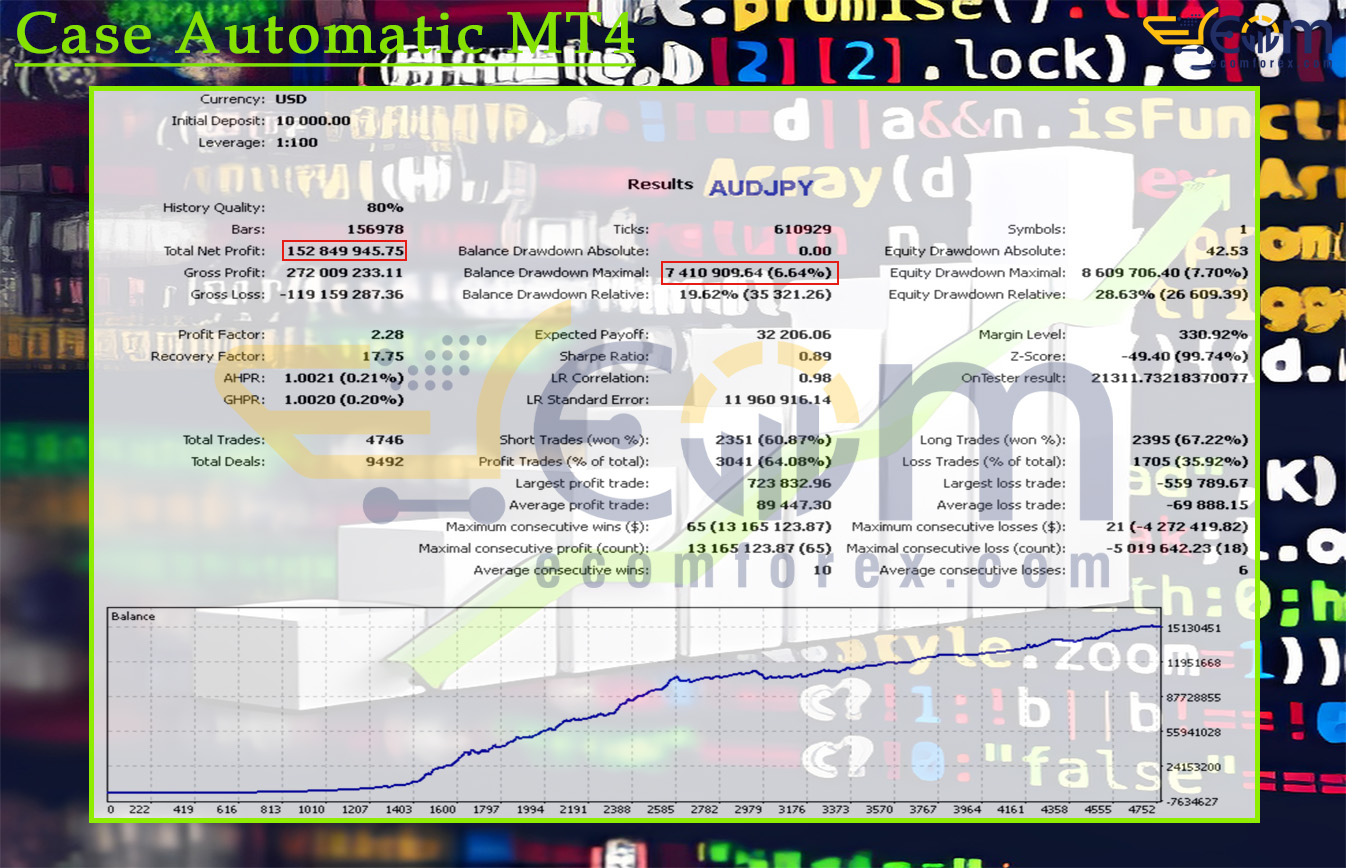 Case Automatic MT4 delivered robust and consistent long-term profitability over a multi-year backtest on the AUDJPY pair, maintaining stable growth even through extended periods of volatility. Its intelligent trend-driven engine and disciplined risk-management framework produced smooth equity compounding while keeping drawdown at controlled and manageable levels.