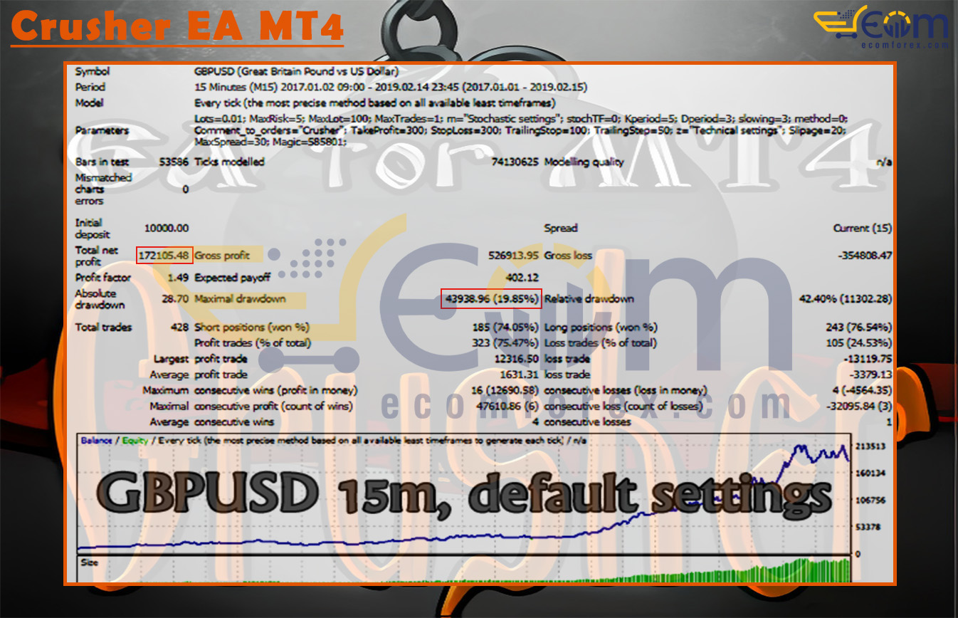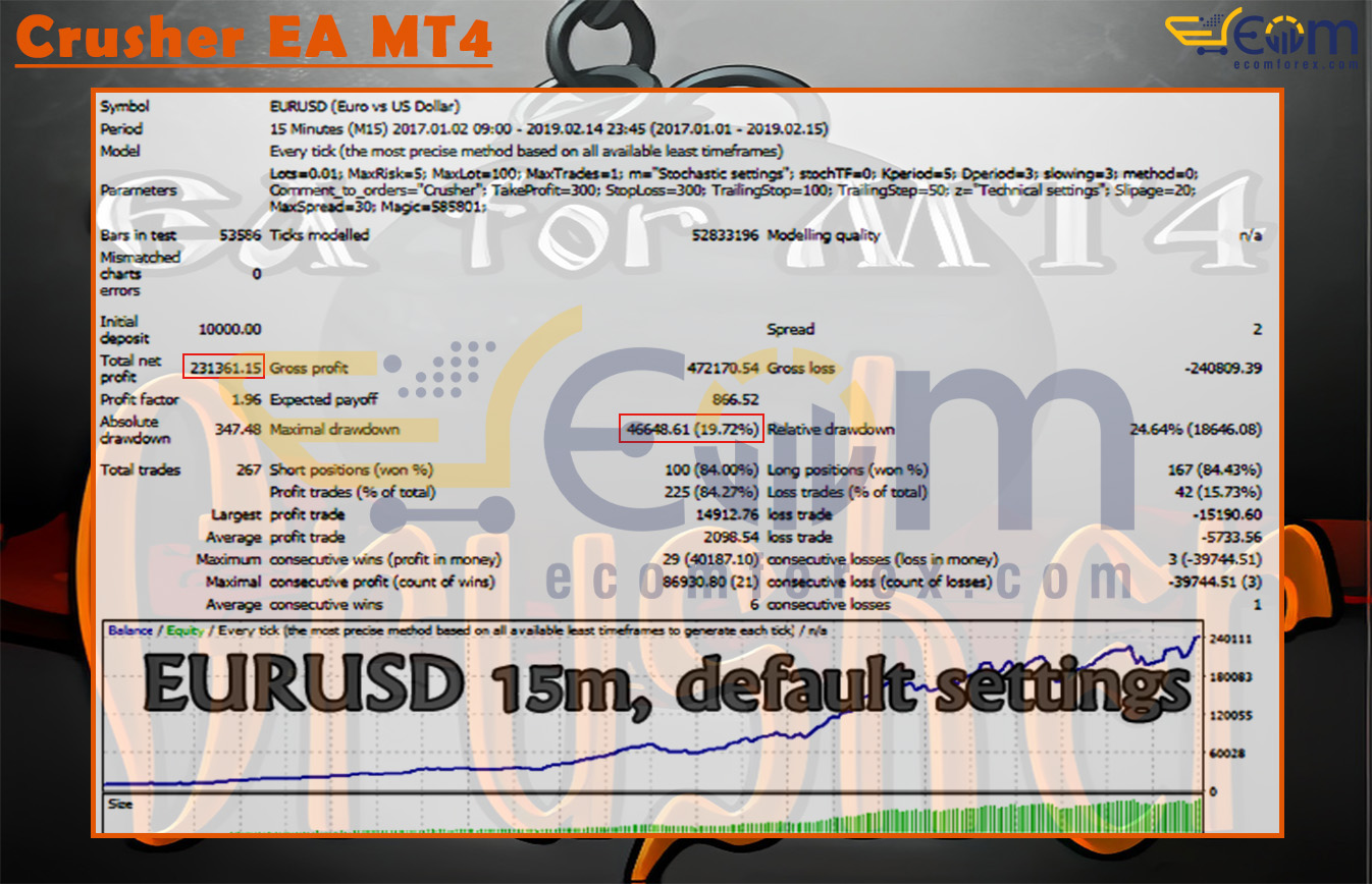 Crusher EA MT4 (EURUSD 15M, Default Settings) has exhibited strong and stable profitability during its backtesting phase, validating its precision in detecting trend reversals and alignment between stochastic momentum and fractal dissonance patterns.