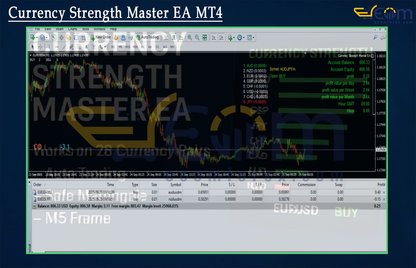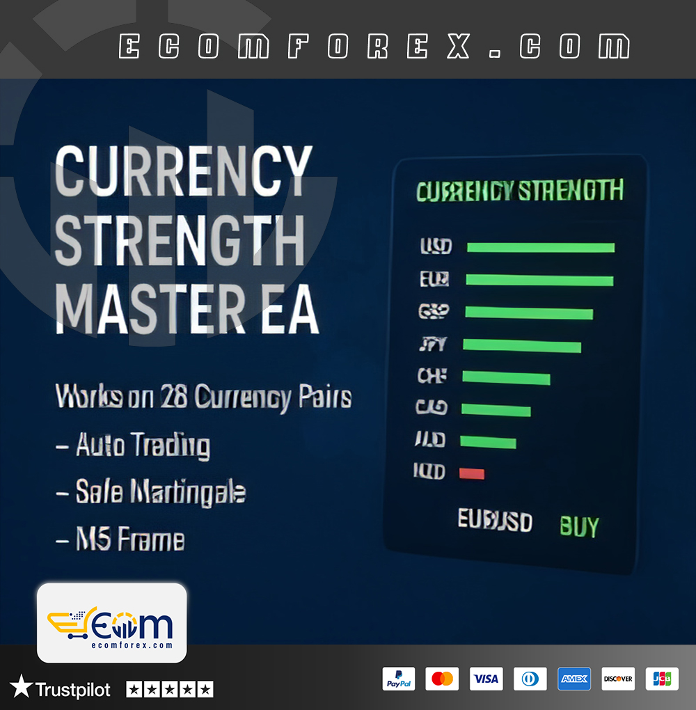 With more than 20 years of experience trading forex across every major cycle — from carry trades and risk-on rallies to safe-haven flights and high-volatility news events — I have always considered currency strength analysis one of the most reliable edges available. Currency Strength Master EA MT4 is a clever, fully automated Expert Advisor (EA) for MetaTrader 4 (MT4) that runs on a single M5 chart while internally scanning 28 currency pairs in real time to identify the strongest and weakest currencies among the 8 majors (USD, EUR, GBP, JPY, CHF, CAD, AUD, NZD).