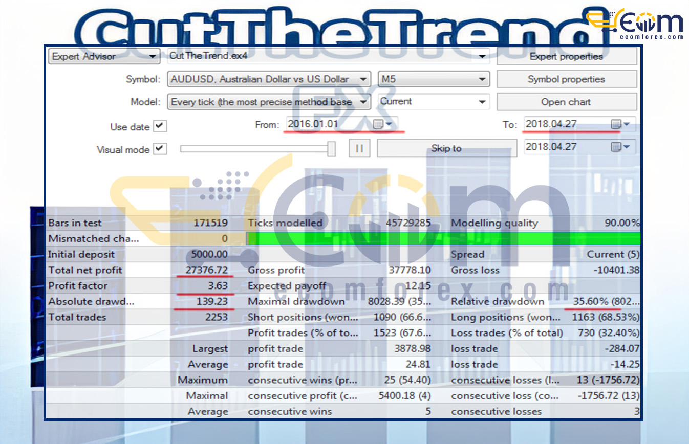 CutTheTrend FX EA has shown very strong and consistent results in a comprehensive 28-month backtest on the EURUSD pair — the most liquid forex instrument — proving the effectiveness of its pure price action logic combined with strictly limited step-grid recovery.