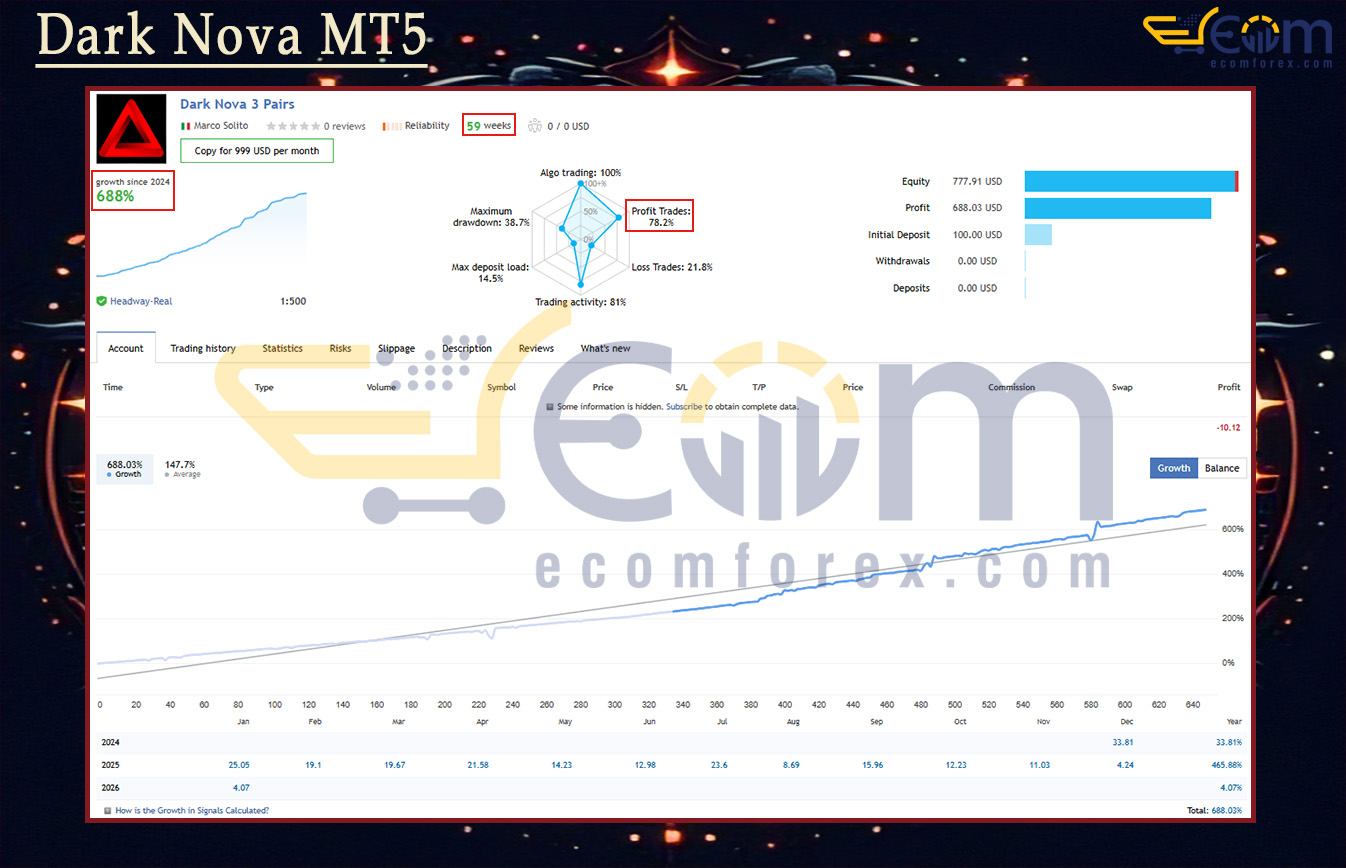 Dark Nova MT5 has proven its real-world edge with outstanding live trading results on a verified account, delivering strong compounded growth across 59 consecutive weeks of uninterrupted performance.