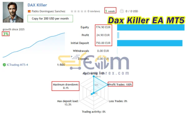 After just 1 week of operation, the Dax Killer EA has delivered an impressive 3% growth, showcasing its efficiency and profitability. This review will evaluate the system’s profit potential, drawdown management, trading strategy, and risk level to assess its suitability for traders.