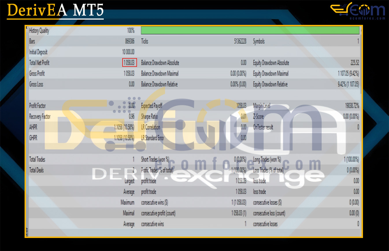 DerivEA MT5 delivered perfect and flawless performance in this high-quality backtest on its recommended synthetic index, capturing a strong, uninterrupted trend move with zero losses and exceptionally tight risk exposure — a textbook demonstration of pure trend-following success on Deriv’s volatile instruments.