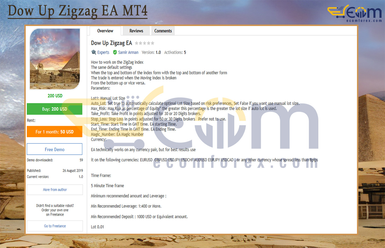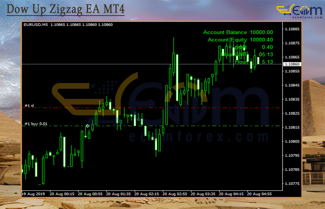 With over 20 years of professional Forex trading, including countless hours dissecting swing structures and breakout systems, I consider ZigZag-based EAs among the most reliable for capturing clean trend continuations while filtering noise. Dow Up Zigzag EA MT4 uses the classic ZigZag indicator (default settings) to identify significant swing highs and lows. It enters trades precisely when price breaks the most recent swing point — confirmed by crossing a moving average (from bottom up for buys, top down for sells) — turning potential reversals into high-probability momentum plays.