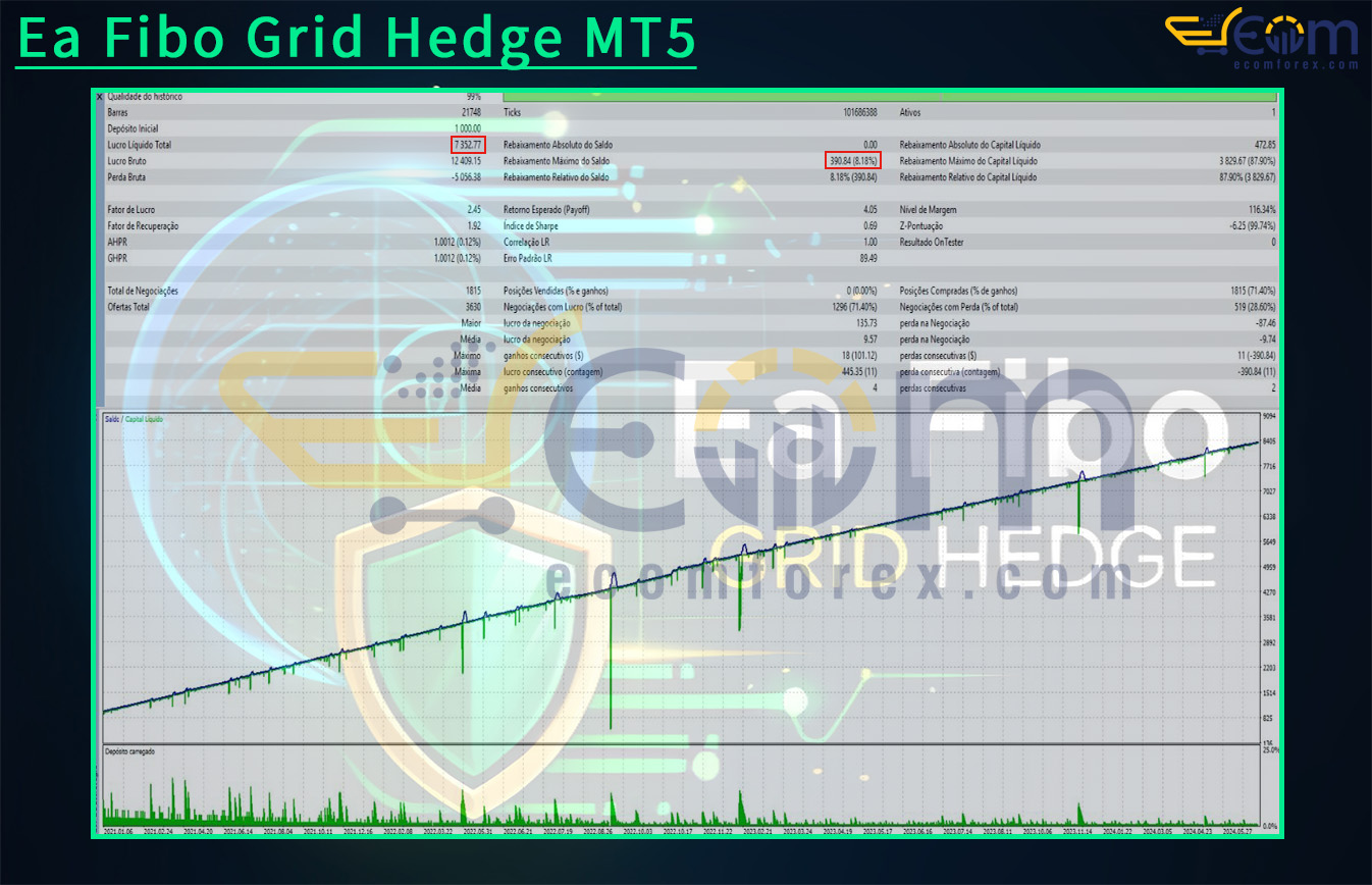 Tested on over 1,800 simulated trades, EA Fibo achieved a Profit Factor of 2.45, proving its adaptability and robust defense strategy.