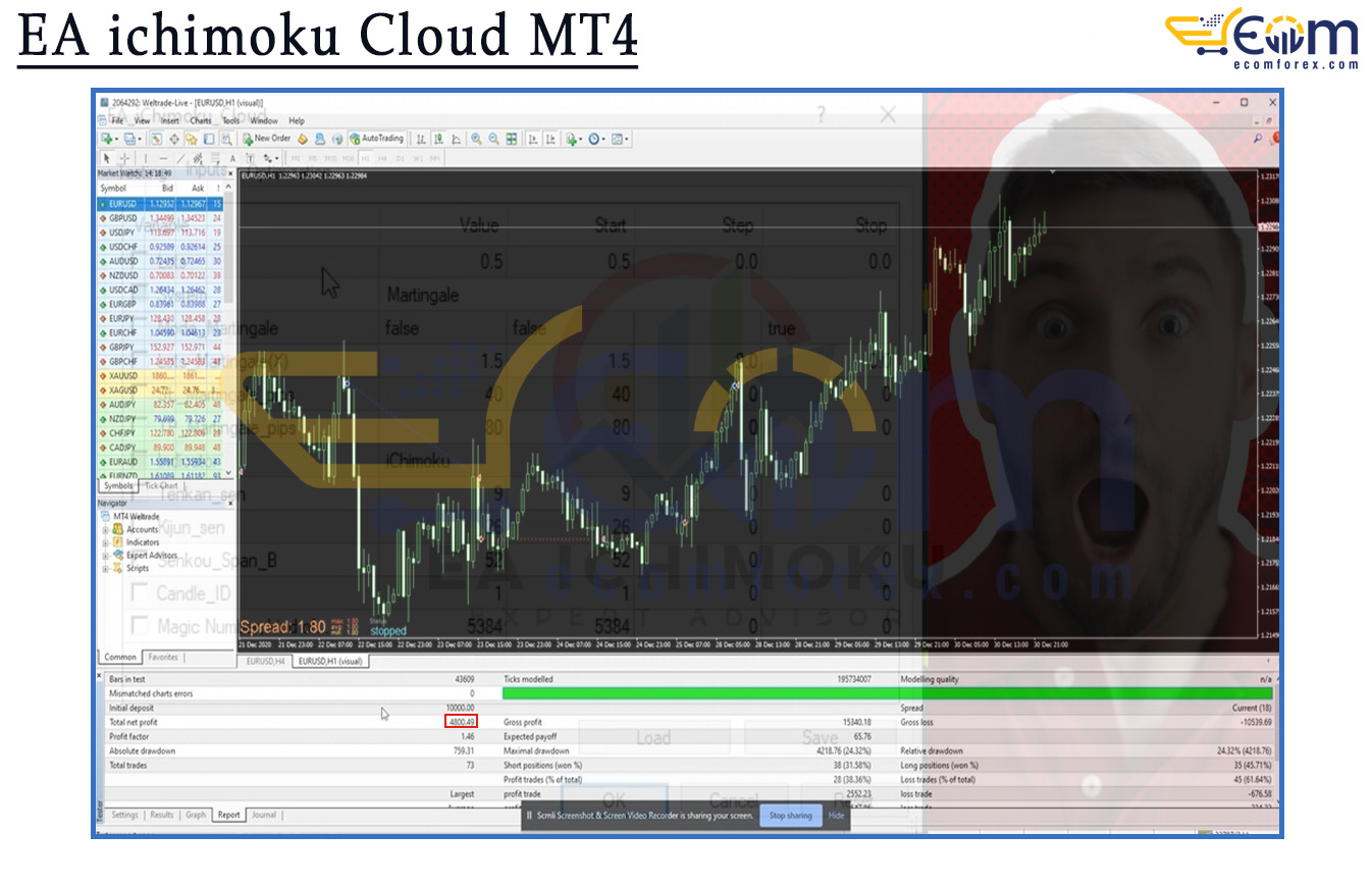EA Ichimoku Cloud MT4 is an algorithmic trend analysis Expert Advisor (EA) that uses all core Ichimoku components to determine high-probability entries and exits. Instead of relying on a single indicator, it evaluates the market from multiple dimensions—trend strength, volatility, and price positioning—before executing trades.