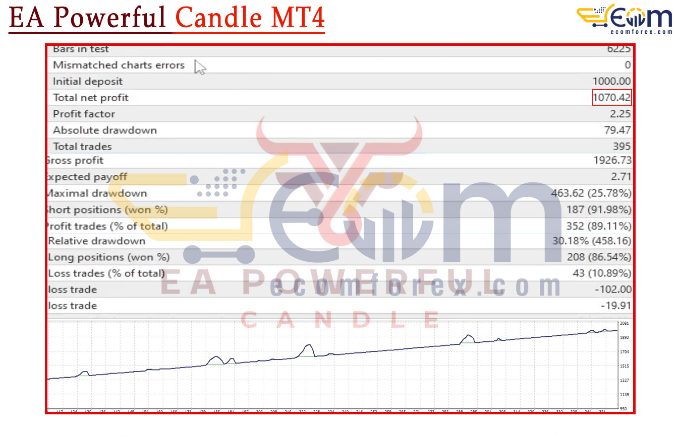 Powerful Candle EA MT4 demonstrated solid and consistent performance in this backtest, highlighting its ability to extract profits from clear candlestick-based market movements while maintaining structured risk control. The strategy focuses on high-probability candle signals combined with disciplined trade management, resulting in a strong profit factor and a high percentage of winning trades. Despite operating with a relatively active trading frequency, the EA maintained acceptable drawdown levels, reflecting a balanced approach between opportunity capture and capital protection.