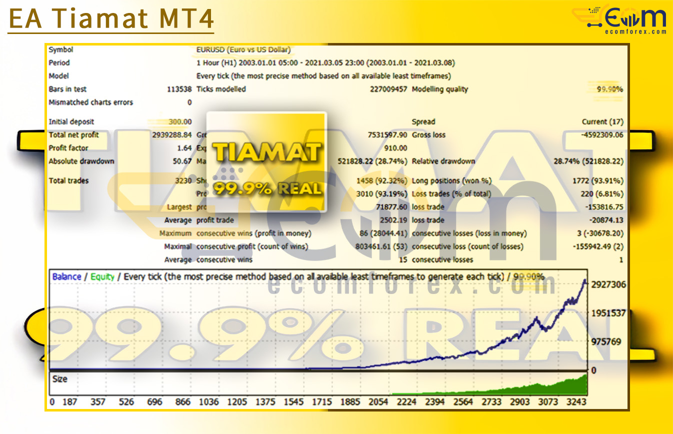 The Tiamat EA has shown outstanding profitability and consistency in long-term backtesting, validating its ability to generate steady returns with disciplined execution. Over an 18-year testing period (2003–2021, EURUSD, H1 timeframe), the system delivered powerful results by achieving significant net profits while maintaining controlled drawdowns, making it a dependable choice for traders seeking sustainable growth.