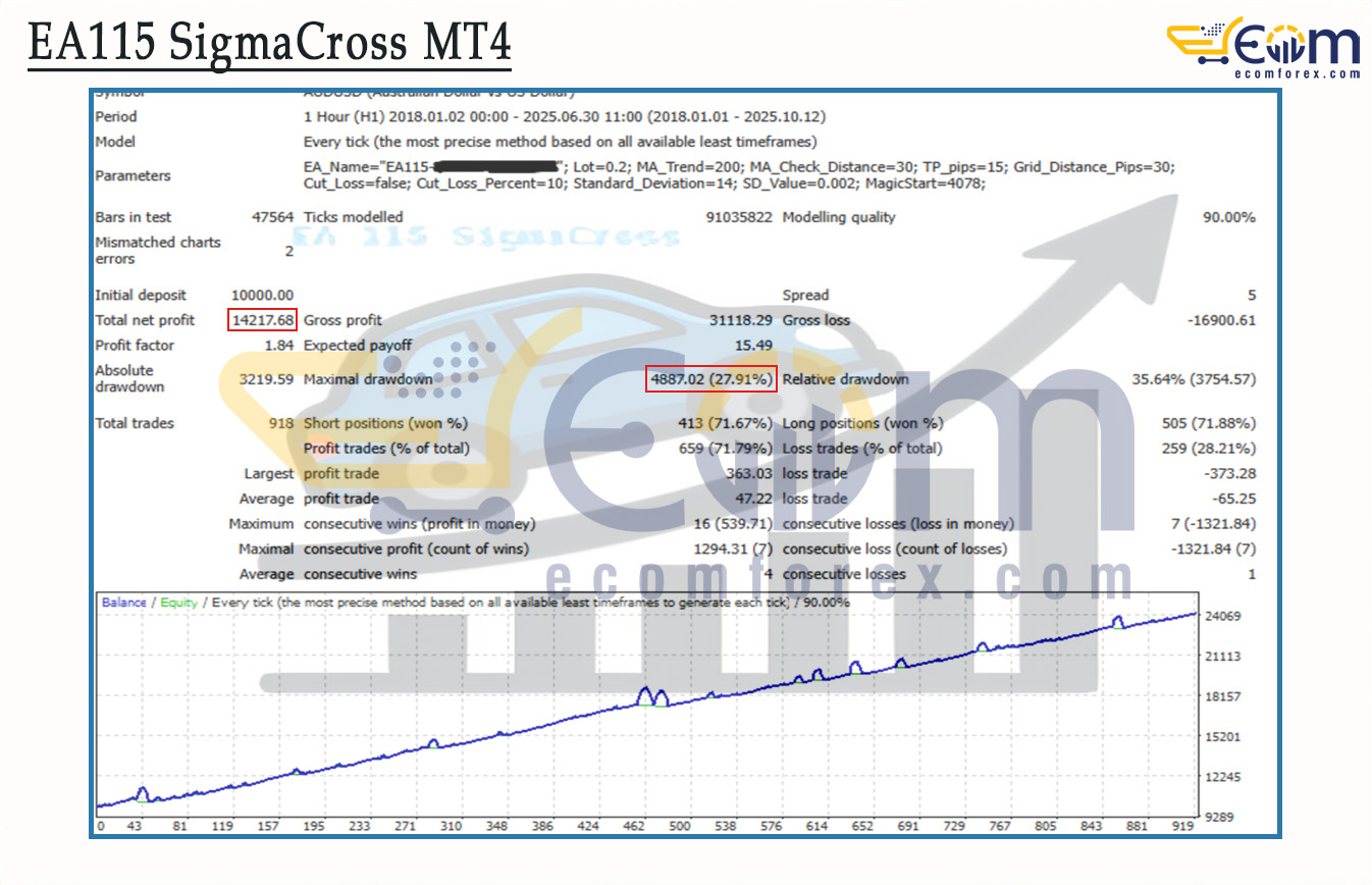 EA115 SigmaCross MT4 delivered robust long-term profitability over an ~8-year backtest (2018–2025) on the AUDUSD H1 timeframe. With 90% modeling quality and every-tick precision, the EA effectively identified overextended deviations from the long-term trend (using standard deviation and MA baseline) and captured reversals with adaptive grid recovery when needed — producing strong compounded gains with reasonable drawdown control for a deviation-reversal hybrid system.