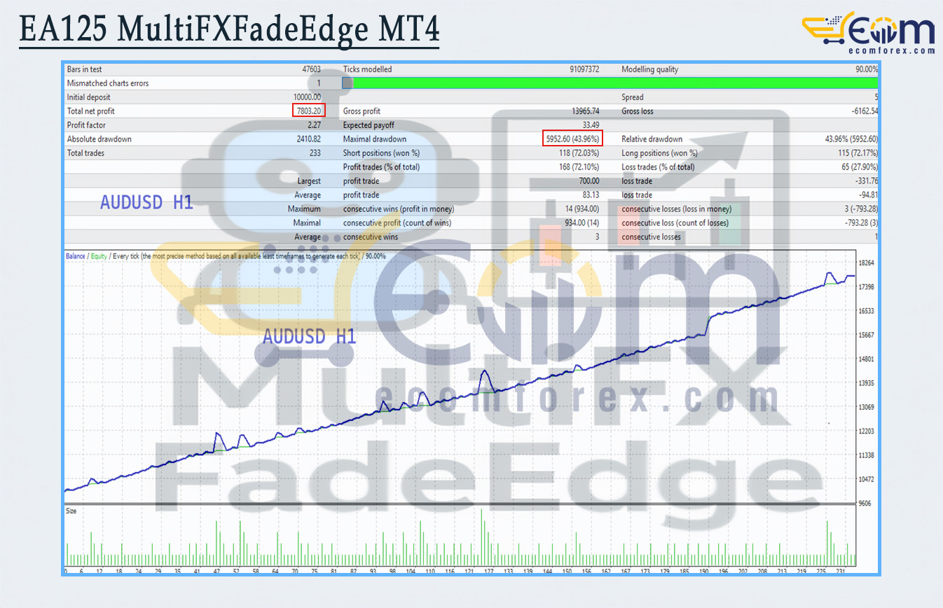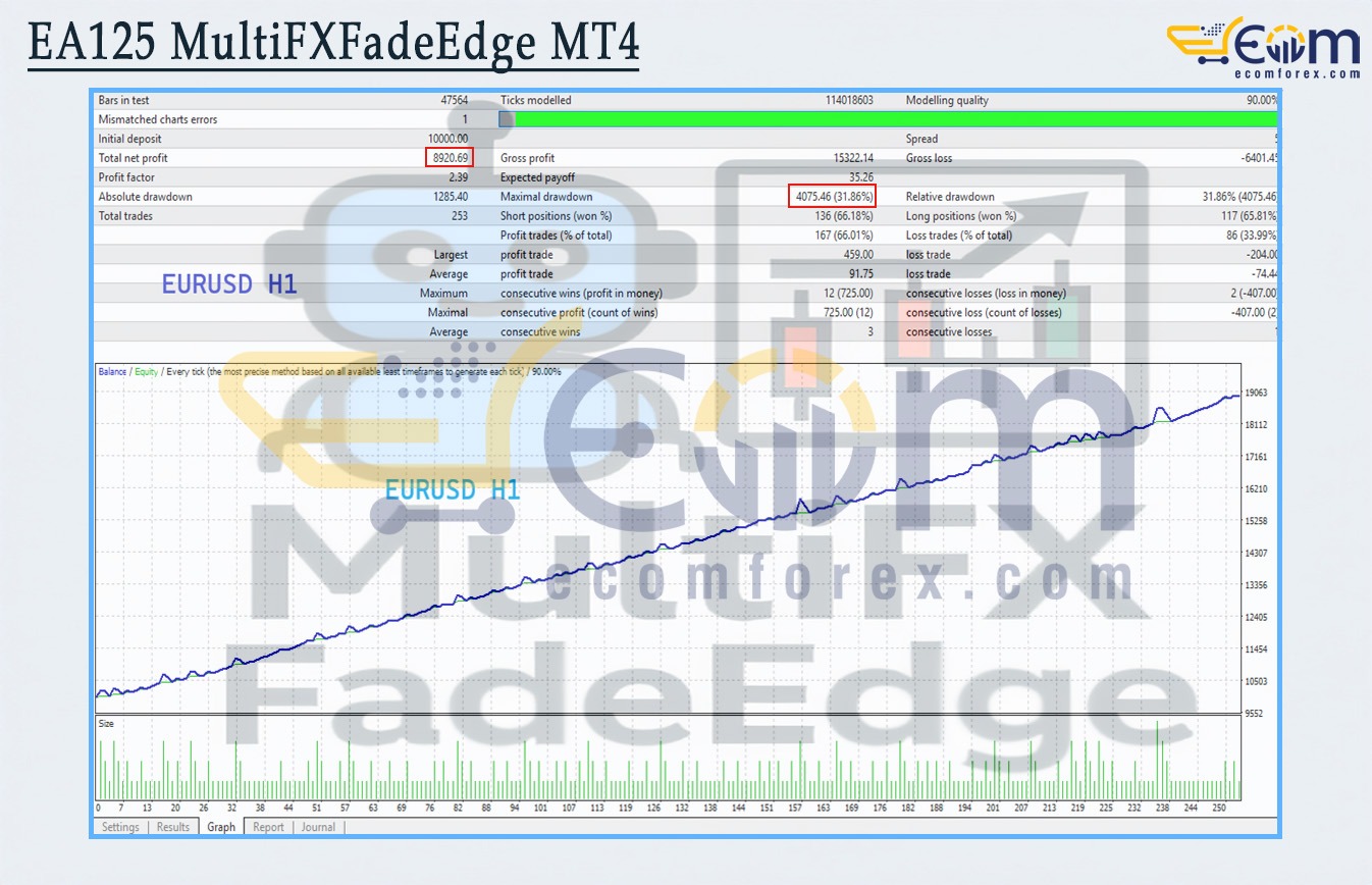 EA125 MultiFXFadeEdge delivered strong and consistent profitability in a comprehensive backtest on the EURUSD H1 timeframe. With 90% modeling quality (only 1 minor mismatched chart error), realistic 5-pip spread simulation, and a large sample of 25,364 bars, the results highlight the EA’s effectiveness at identifying and fading fake breakouts using engulfing candle confirmation and range-based logic — producing solid net gains with remarkably controlled drawdown for a counter-trend fade strategy.