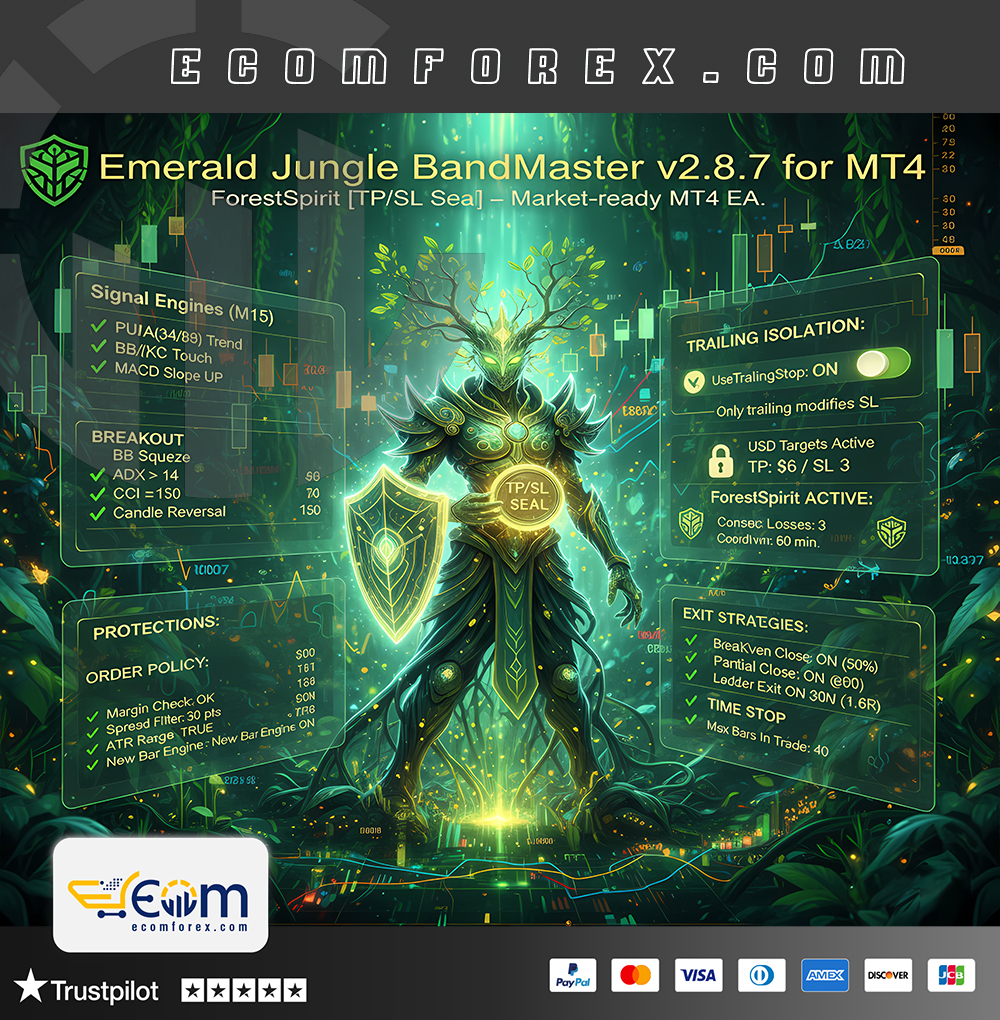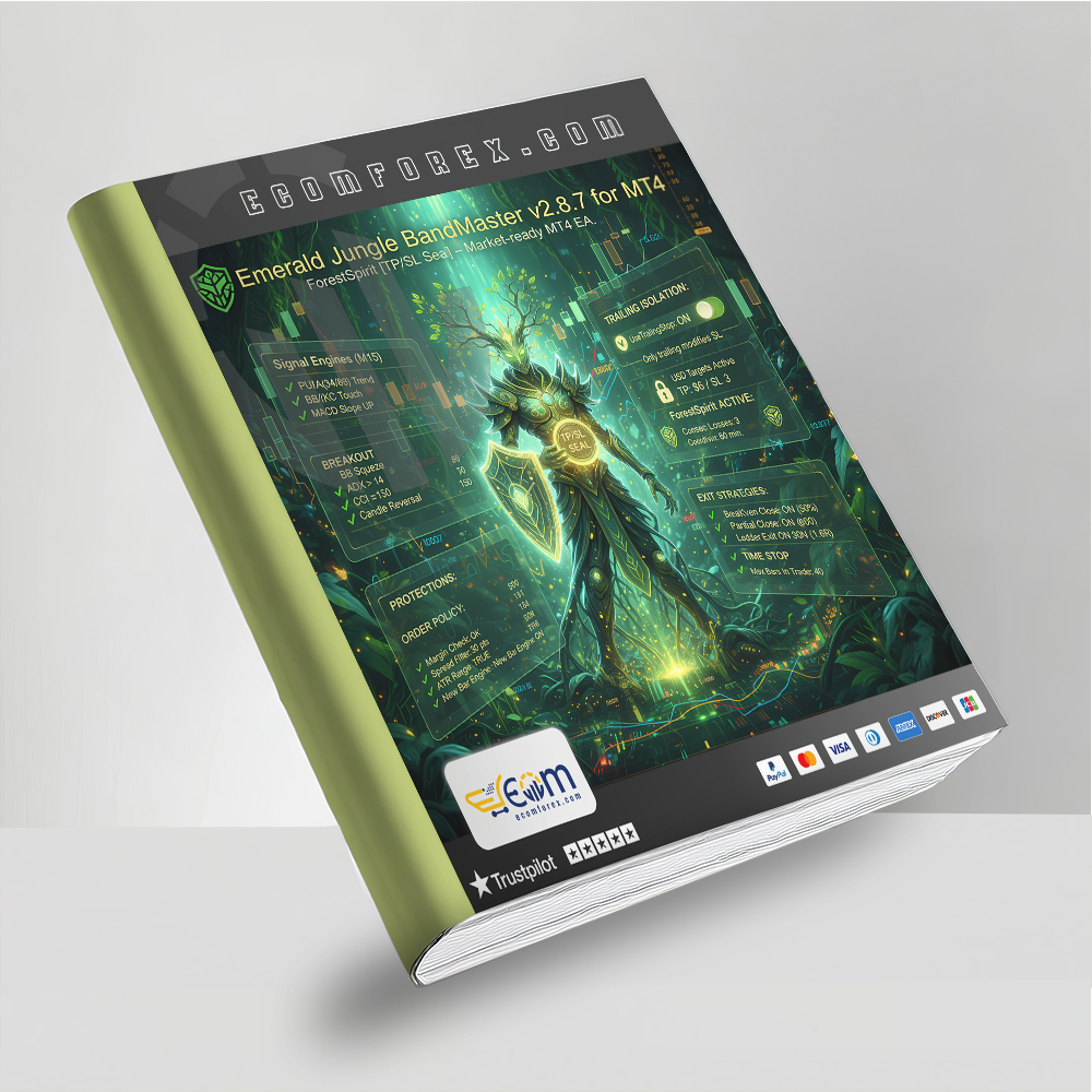 Emerald Jungle BandMaster MT4 is an advanced M15 Expert Advisor (EA) designed to navigate the “liquidity rainforest” of the market. The EA blends trend-pullback entries, squeeze breakouts, and mean-reversion snaps to capture high-probability setups.