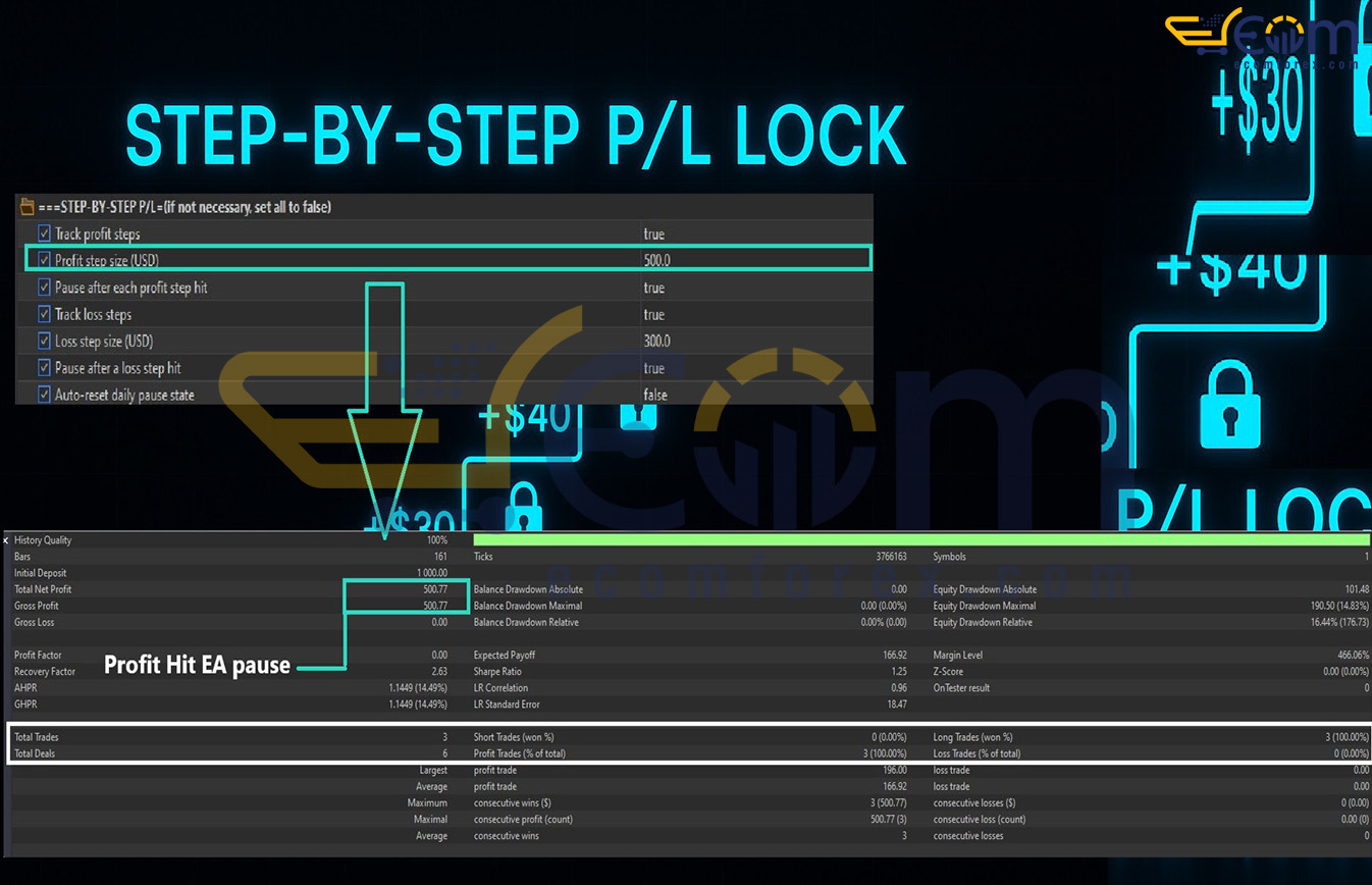 Instead of using fixed take-profit levels, the EA employs multi-step profit protection, gradually securing accumulated gains as market conditions evolve.