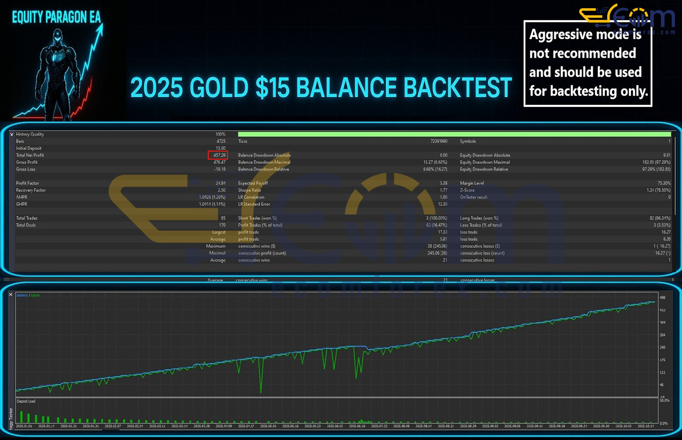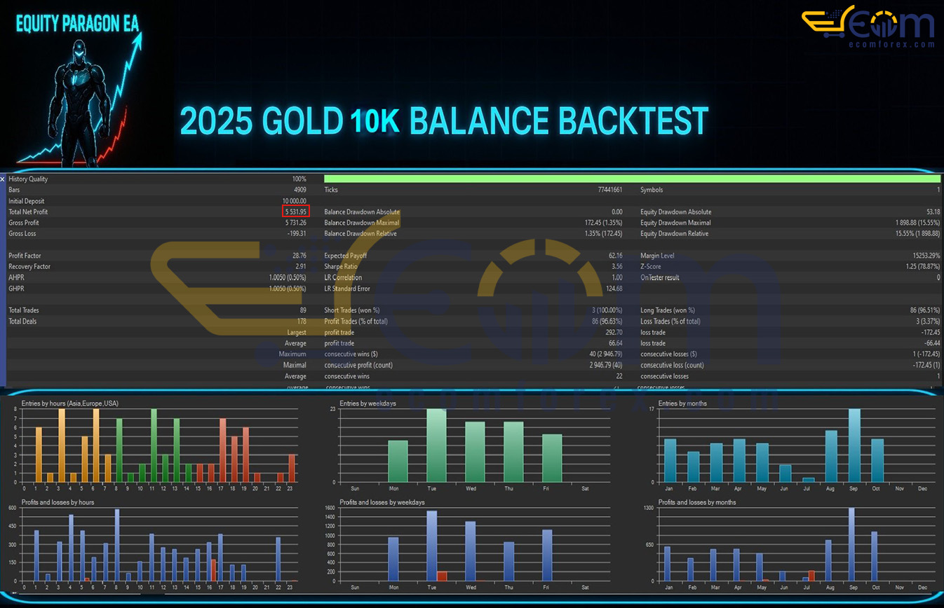 Equity Paragon EA MT5 delivered impressive short-term profitability throughout this 2025 aggressive-mode backtest, maintaining a smooth upward equity curve while operating under a highly volatile XAUUSD environment.