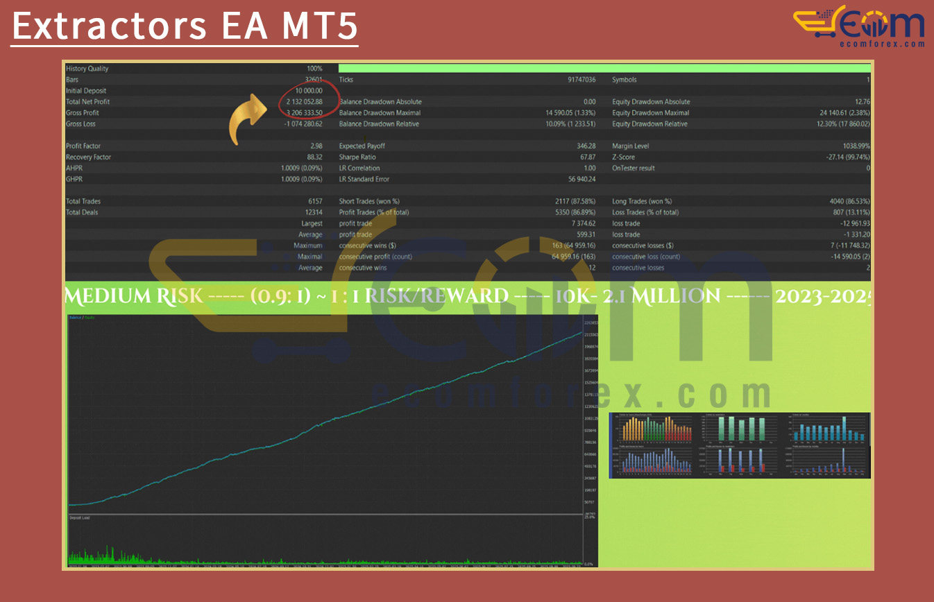 Extractors EA (High-Risk Risk/Reward Mode) has proven its exceptional profitability and controlled risk management in a two-year backtest, growing a $10,000 account to over $3.8 million between 2023–2025.