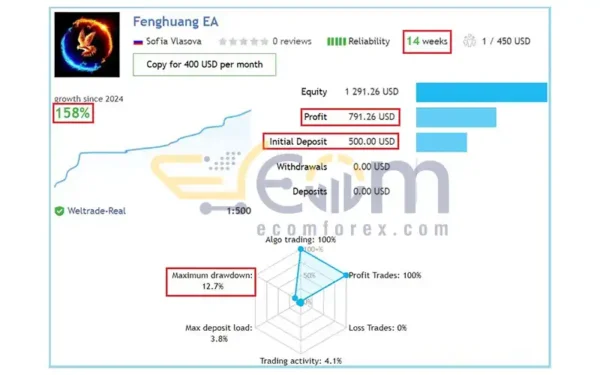 Fenghuang Rig EA genuine trading outcomes utilizing a real account with a starting deposit of $500 revealed a total profit of 158% after 14 weeks of uninterrupted trading, while maintaining a risk level of only 12.7%. These trading results demonstrate remarkable capabilities in the Forex trading sector and effective Gold trading.