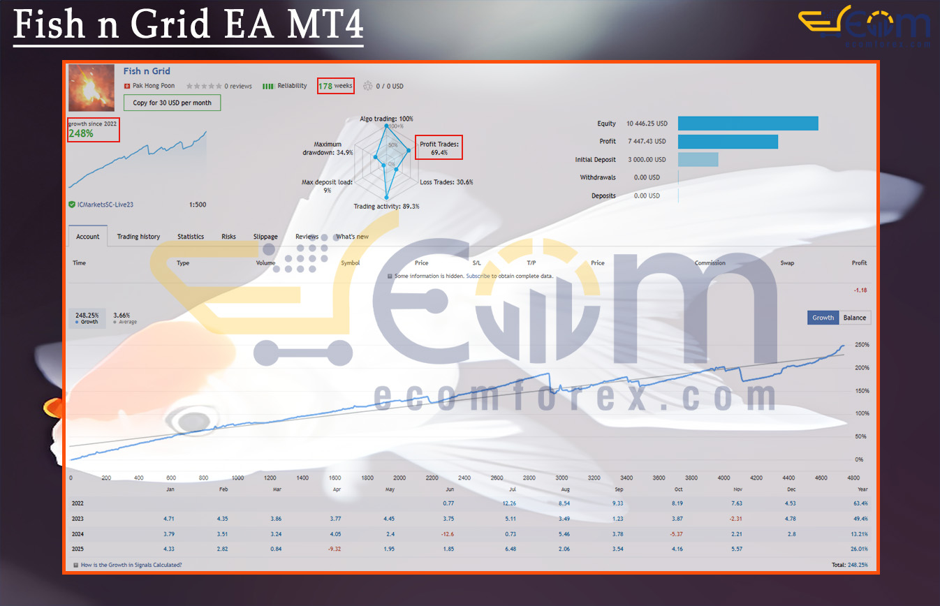 Fish n Grid EA MT4 is a versatile, multi-pair trading robot engineered to operate across virtually any currency pair. Its profitability has been fully validated through verified real-account performance, demonstrating consistent results under live market conditions.