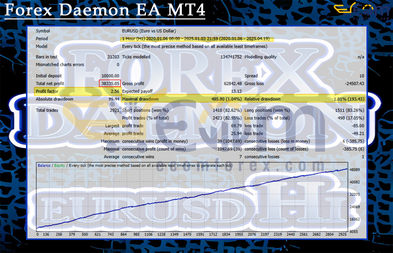 Forex Daemon EA has showcased steady profitability and exceptional long-term consistency throughout its 5-year backtest on EURUSD (H1 timeframe).