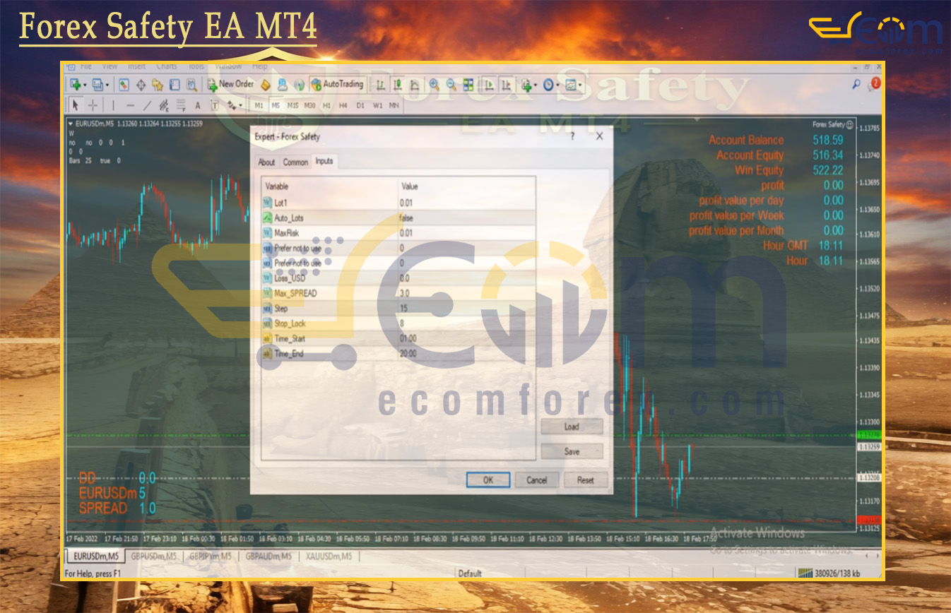 Forex Safety EA MT4 is a smart hedging grid Expert Advisor (EA) for Meta Trader 4 (MT4) optimized primarily for Gold (XAUUSD) on M5 timeframe, also usable on currency pairs. It starts with a directional trade, adds grid orders in the adverse direction at fixed Step distance (10 pips for forex, 100 points for gold), caps at 8 same-direction orders, then opens an equal-lot opposite hedge when reaching the limit. After hedging, it pauses for 1 hour, then restarts the cycle. All trades close together when total Account Equity profit exceeds the set Win Equity value. No individual TP/SL; uses internal trailing stop on the initial trade to chase profits early. The built-in safety (8-order cap + hedge + pause) prevents one-sided runaway drawdown and full account wipeout in strong trends.