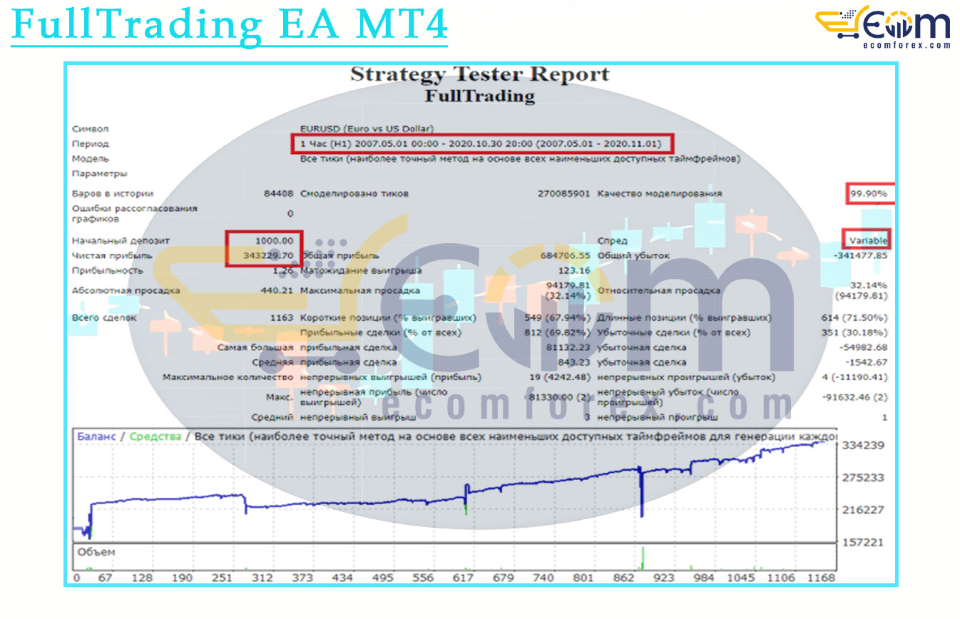 FullTrading EA has demonstrated outstanding long-term profitability and consistent performance throughout a 13-year backtest period (2007–2020) on the EURUSD (H1 timeframe).