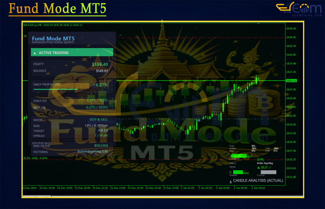 Fund Mode MT5 is a pure price action Expert Advisor (EA) that trades only high-quality Engulfing patterns with multi-layer confirmation — completely free of grid, martingale, or hedging. Its focus is maximum capital protection, consistency, and suitability for small accounts and strict risk rules.