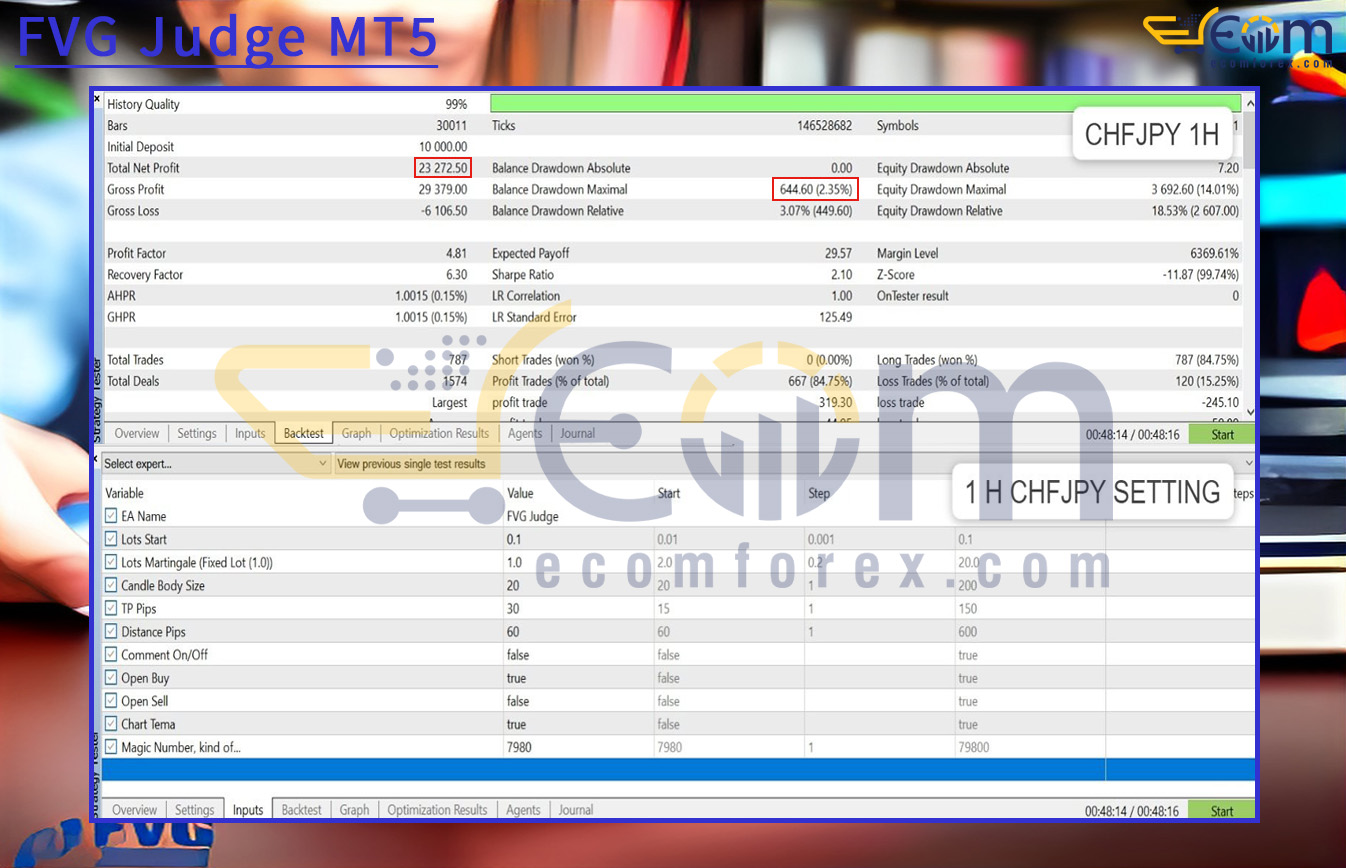 The Fair Value Gap Judge EA demonstrates strong profitability and disciplined trade execution, reflecting a balanced approach to growth and risk management. In this backtest on the CHFJPY H1 timeframe, starting with an initial deposit of $10,000, the EA generated a net profit of $23,272.50. With a solid profit factor of 4.81 and a high win rate of 84.75%, the system proved its ability to secure consistent returns while maintaining sustainable drawdowns.