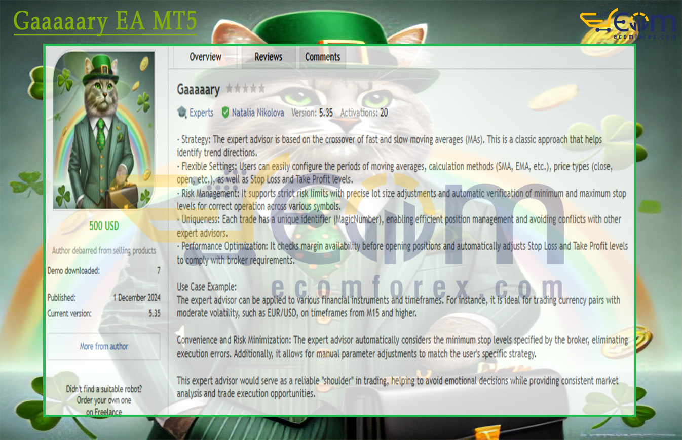 Gaaaaary EA MT5 is a robust, classic Expert Advisor (EA) for MetaTrader 5 (MT5), built on the proven fast and slow Moving Average crossover strategy — a cornerstone trend-following system used by traders worldwide to capture directional market moves with clarity and discipline.
