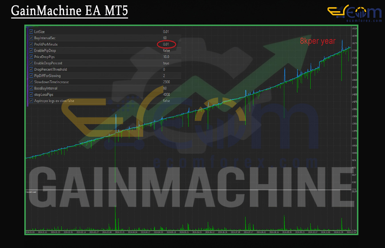 GainMachine EA MT5 is a precision-powered automated trading system that strategically buys into market dips using scaled-in entries. It does not close trades at a fixed target. Instead, it uses a dynamic profit target that increases the longer the position is held — helping traders capture more profit during strong recoveries while avoiding premature exits.