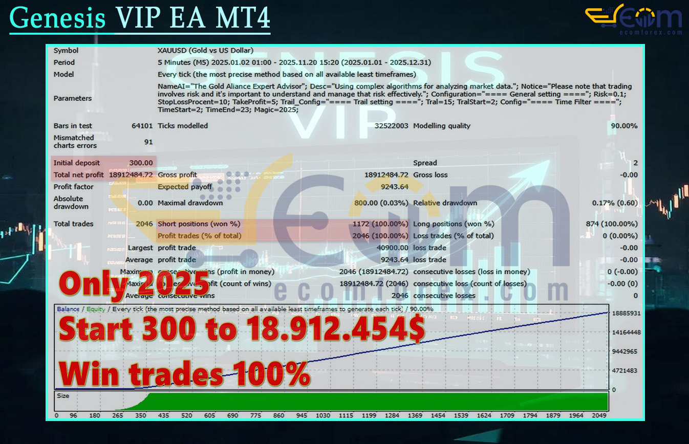 Genesis VIP EA has delivered extraordinary short-term profitability in this intensive 2025 backtest on XAUUSD, showcasing flawless execution, perfect trade accuracy, and near-zero risk exposure.