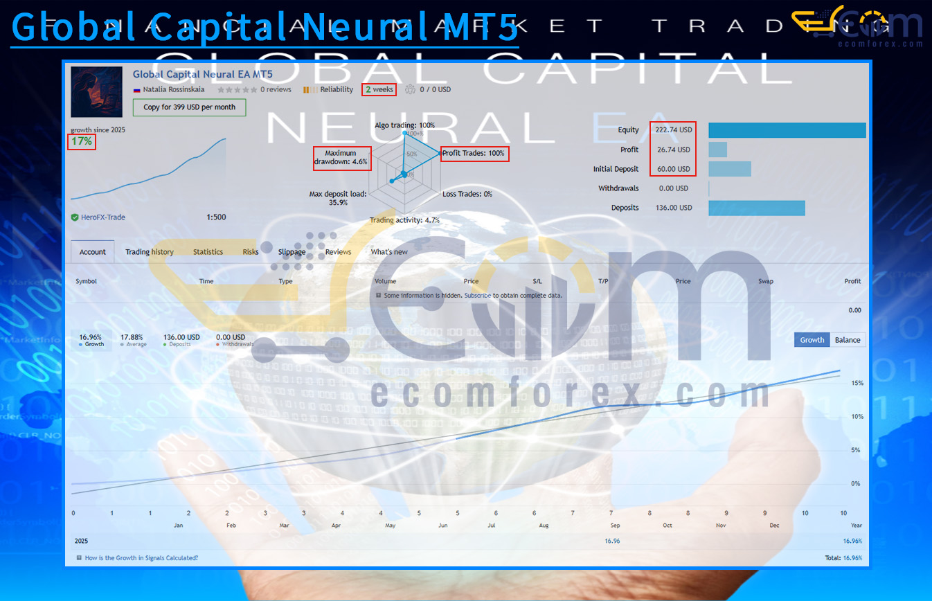 With over 20 years of trading experience, I can affirm that Global Capital Neural MT5 is not just another Expert Advisor (EA), but a next-generation AI trading system built on a proprietary neural module architecture. Its core concept lies in the combination of adaptive market analysis and strict risk management, allowing it to maintain stable performance under diverse trading conditions.