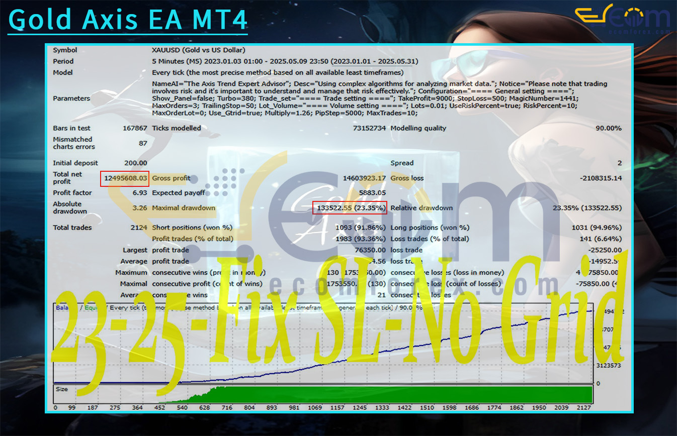 The Axis Gold Trend EA demonstrates strong long-term growth and consistent performance, showcasing a disciplined balance between profitability and risk management. In this backtest, starting from a modest $200 deposit, the EA generated exceptional net profits while maintaining a stable equity curve and sustainable drawdowns.