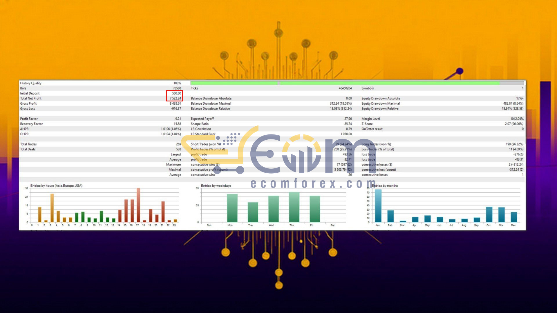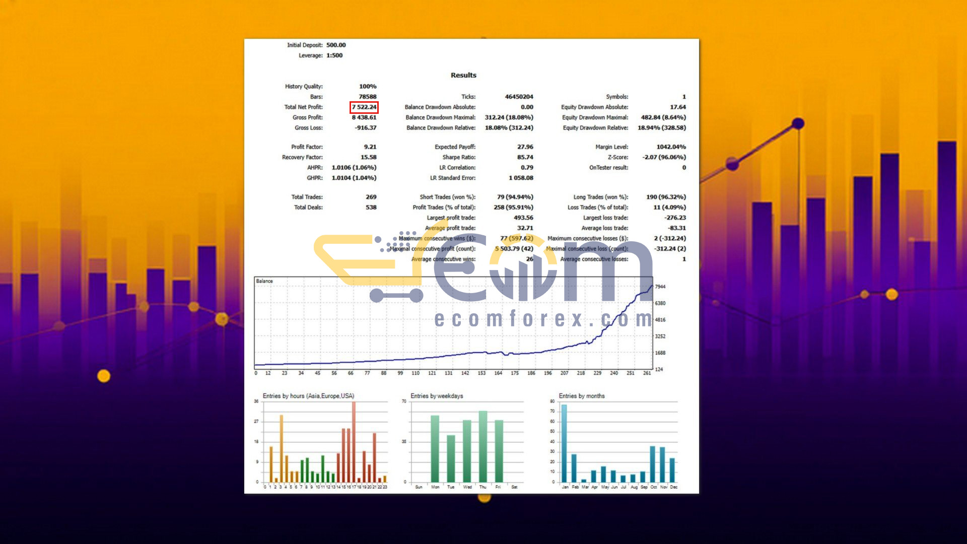 Starting with a $500 initial deposit, the EA generated an impressive $7,522.24 net profit with a very strong Profit Factor of 9.21 and a solid Recovery Factor of 15.58.