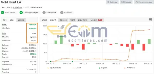 The Gold Hunt EA demonstrates remarkable performance on the IC Markets demo account (leverage 1:1000) via the MetaTrader 4 (MT4) platform. With an impressive gain of +286.13%, this EA effectively capitalizes on market opportunities. The daily growth rate of 4.05% and a monthly return of 242.51% indicate its high-profit potential.