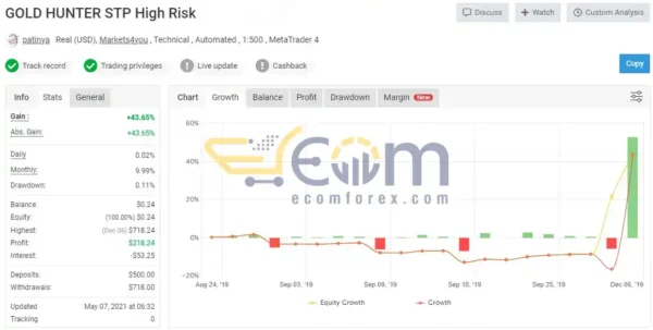 The GOLD HUNTER STP High Risk EA, running on a real account with Markets4you (leverage 1:500) via the MetaTrader 4 (MT4) platform, shows moderate profitability with a gain of +43.65%. The system achieves a daily growth rate of 0.02% and a monthly increase of 9.99%.